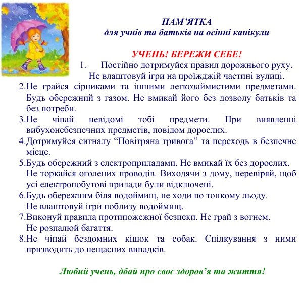 Увага! Під час канікул відповідальність за життя та здоров'я дітей несуть батьки!